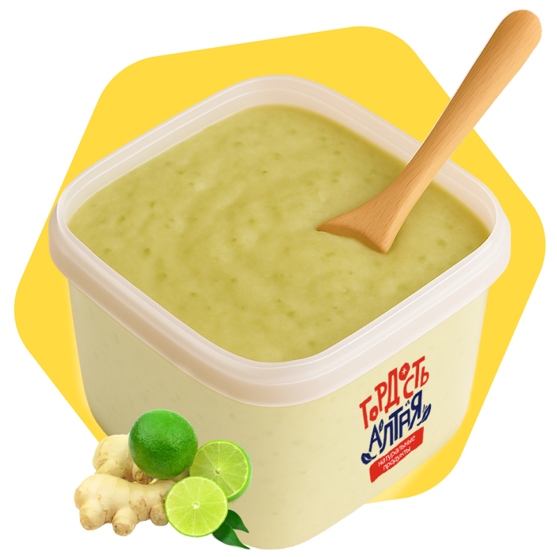 Крем-мёд “Лайм–Имбирь” — это нежный, взбитый десерт на основе натурального алтайского мёда с добавлением натурального лайма и молотого имбиря. Имеет яркий цитрусово-пряный вкус с лёгкой остринкой, кремообразную текстуру и насыщенный аромат. Производится без сахара, консервантов и ароматизаторов — только натуральные компоненты. Крем-мёд стабилизирован методом холодного взбивания, не подвергается термообработке и сохраняет все полезные свойства.
